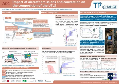 Within TPChange Phase II, A01 aims to partially answer questions related to RQ-A1, RQ-A2, RQ-A3, and RQ-C1. More specifically, the project will utilize data from the two HALO missions to address the following key questions: How do aircraft emissions influence the chemical composition, microphysical processes and the radiative balance of the tropopause region? And, how does aerosol and ice nucleation within extratropical convective outflows depend on the concentrations of precursor gases SO2 and HNO3? The data will be used to evaluate a contrail model (CoCiP), and climate models (EMAC, ICON), closely collaborating with 8 other projects in TPChange research areas A, B, C, and Z.