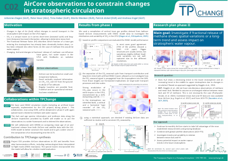 In project C02 we perform regular AirCore observations using small balloons launched from Frankfurt. These measurements have been started during phase I of our CRC and allow for the measurements of vertical profiles of CO, CH4 and CO2 on a bimonthly basis. This is a very cost-effective method of getting information on trace gas distribution up to altitudes of about 27 km. These data will be combined with similar observations from Boulder/Colorado and other locations in Europe, and with satellite data from the ACE-FTS instrument. This allows us to build a data base of trace gas distributions in the lower stratosphere. From the CO2 measurements we can derive mean age, which is a measure of the transport time needed to exchange airmasses between the troposphere and the stratosphere and thus also a measure of the strength of the stratospheric circulation. A changing stratospheric circulation should influence both mean age and also the chemical breakdown of CH4, methane. Therefore, we will complete the analysis by also looking at the ratio of methane at a given location relative to its tropospheric abundance. The more photochemistry an air parcel has experienced since its last contact with the troposphere, the less methane there should be. Therefore, this can give us something like a photochemical age. Comparing this to the observed mean age at the same location can give insight into changing transport pathways. The photochemical breakdown of methane will produce water vapour, so these processes also influence the water vapour distribution in the lower stratosphere. Therefore, we will investigate the change in mean age and methane and in the correlation between them and compare the observed changes to model results.